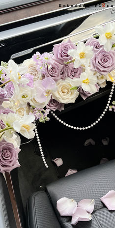 使用新鲜应季鲜花打造的车内浪漫布置,主色为淡紫与奶白,搭配自然垂落的花艺层次与花瓣点缀,营造优雅梦幻的氛围。适用于惊喜接送、纪念日、约会或任何浪漫时刻。